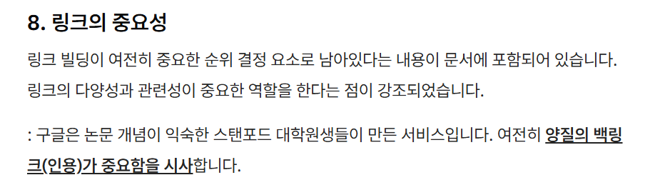 그런데 구글은 링크를 덕지 덕지 달아도 큰 문제는 없었다. 대신 달아 놓은 링크가 나중에 404 에러가 뜨는 이미 닫힌 도메인이라면 그 때는 문제가 좀 발생한다. 블로그의 신뢰도가 낮아질 가능성이 높아지기 때문이다. 그렇지만 링크가 잘 달려있고 작동만되면 구글은 그런 블로그나 페이지를 좋아한다. 아무래도 신뢰도 부분에 대해 링크 유무로 판단하는 것 같았다.