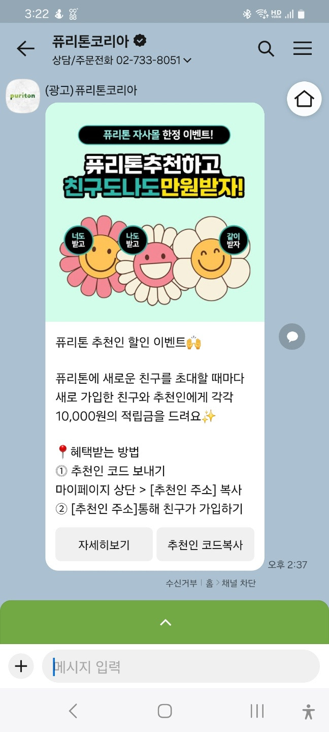 이렇게 채널 가입을 하고 나면 매번 홈페이지 들어갈 필요없이 이벤트 확인이 가능하다. 물건이 필요할 때 구입하는 것도 방법인데 좋은 딜이 들어오면 그 때 주문해도 괜찮다고 생각한다. 오늘 일을 하다가 알림을 하나 받았는데 "친구추천 이벤트"가 있었다.