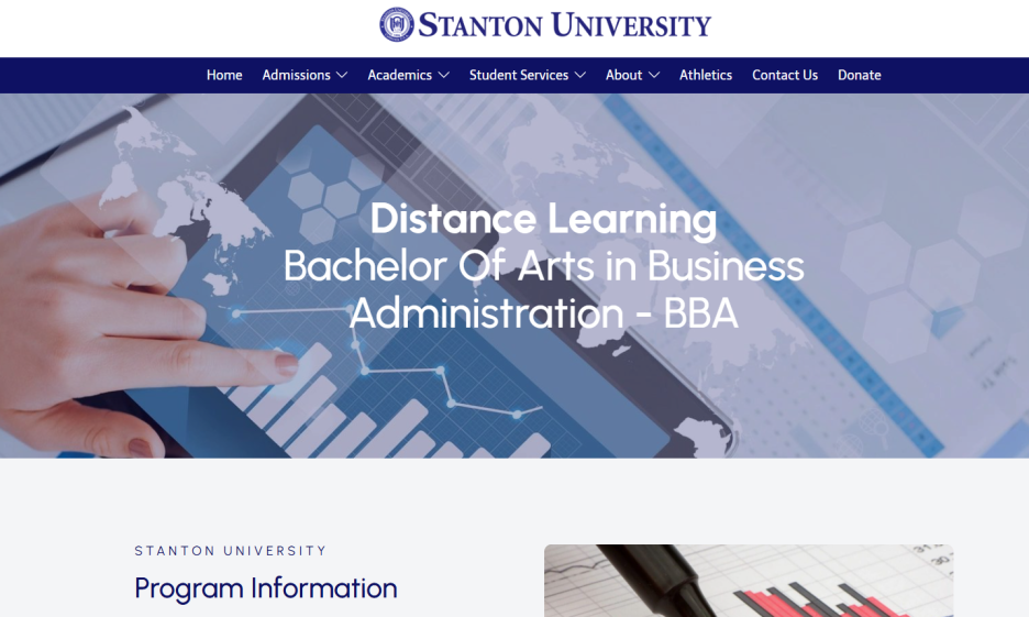 스탠톤 대학교 온라인 경영학 학사 프로그램이 있다. 위에서 본 학교 중에 학비가 가장 저렴하다. 학부생의 경우 1학점당 $220이다. 다른 학교는 $300대를 제시하는데 그것에 비해 경제적 부담이 덜하다. 온라인으로 수업을 받다가 캠퍼스 전환이 가능한 것으로 보였다. 특별한 요건을 따로 요구하는 것 같지는 않고 전환 과정도 수월한 것으로 보였다. 대학교에서 취득한 학점도 인정이 되는 것으로 보였다. 위치는 캘리포니아 애너하임에 있으며 도심으로부터 거리가 가까워 보였다. 직장을 나중에 찾는데 있어서 유리하게 작용하는 것으로 보였다.