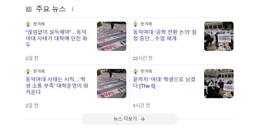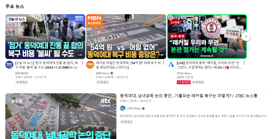 다른 방송국은 이미 동덕여대 총학생회 시위에 대해 부정적인 입장을 내걸었지만 MBC는 최근에 들어서 등을 돌린 것으로 보였다. 진보를 위한 목소리를 내는 방송국 MBC도 손절하는 것 같은 느낌이 들었다. 그래도 한겨레신문사는 동덕여대 총학생회 편에서 계속 기사를 내고 있다. 한겨레가 어느 시점에 어떤 기사를 낼 것인지 상당히 궁금해진다. 아직 한겨레는 동덕여대 총학생회를 손절하지 않은 것 같다. 총학생회 입장에서는 여론전을 할 수 있는 희망의 끈이 하나 있는 것으로 보인다.