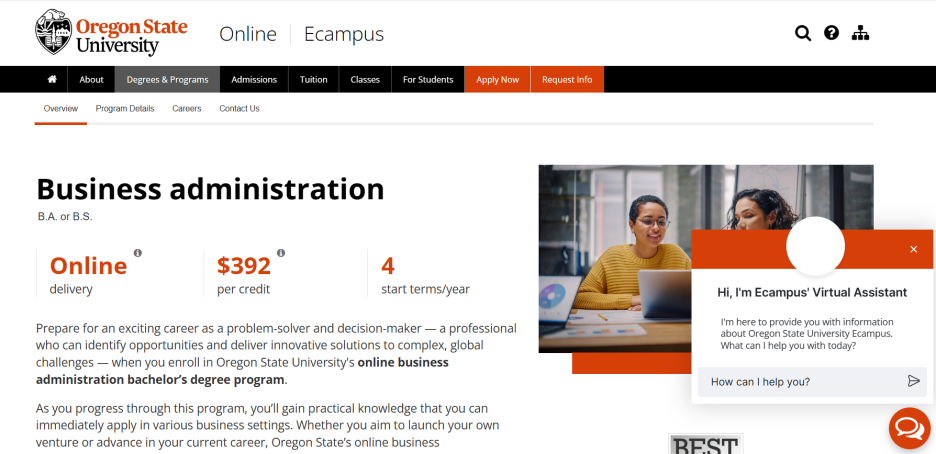 오리건 주립대학교 온라인 경영학 학사 프로그램도 있었다. 이 곳은 정보가 명확하게 드러나지 않아 보였다. 온라인에서 캠퍼스로 전환하는데 반드시 캠퍼스에서 직접 듣는 수업 시수가 있는 것은 찾았지만 다른 구체적인 정보를 보기는 어려웠다.