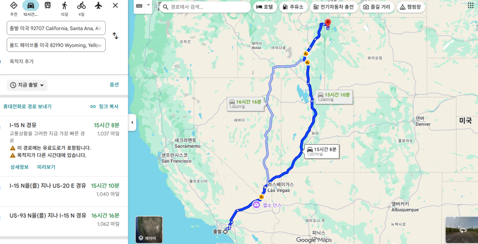 출발지는 오렌지카운티였고 도착지는 와이오밍 국립공원안에 있는 올드페이트풀 롯지였다. 국립공원 안에서 일단 2일 보낼 계획이기 때문이었다.
