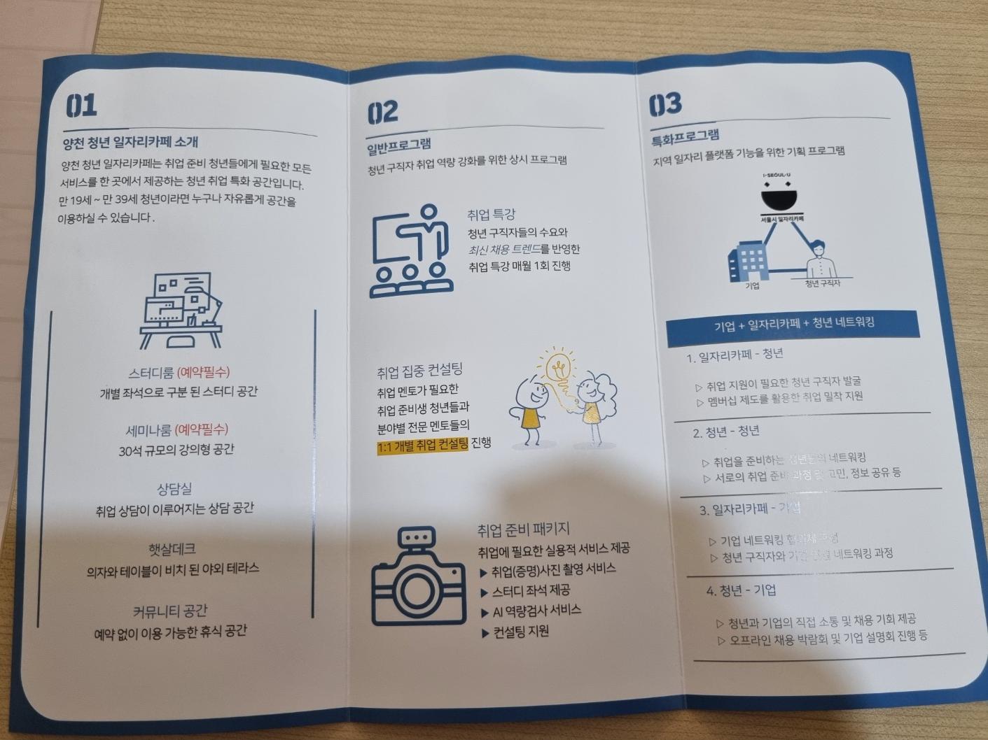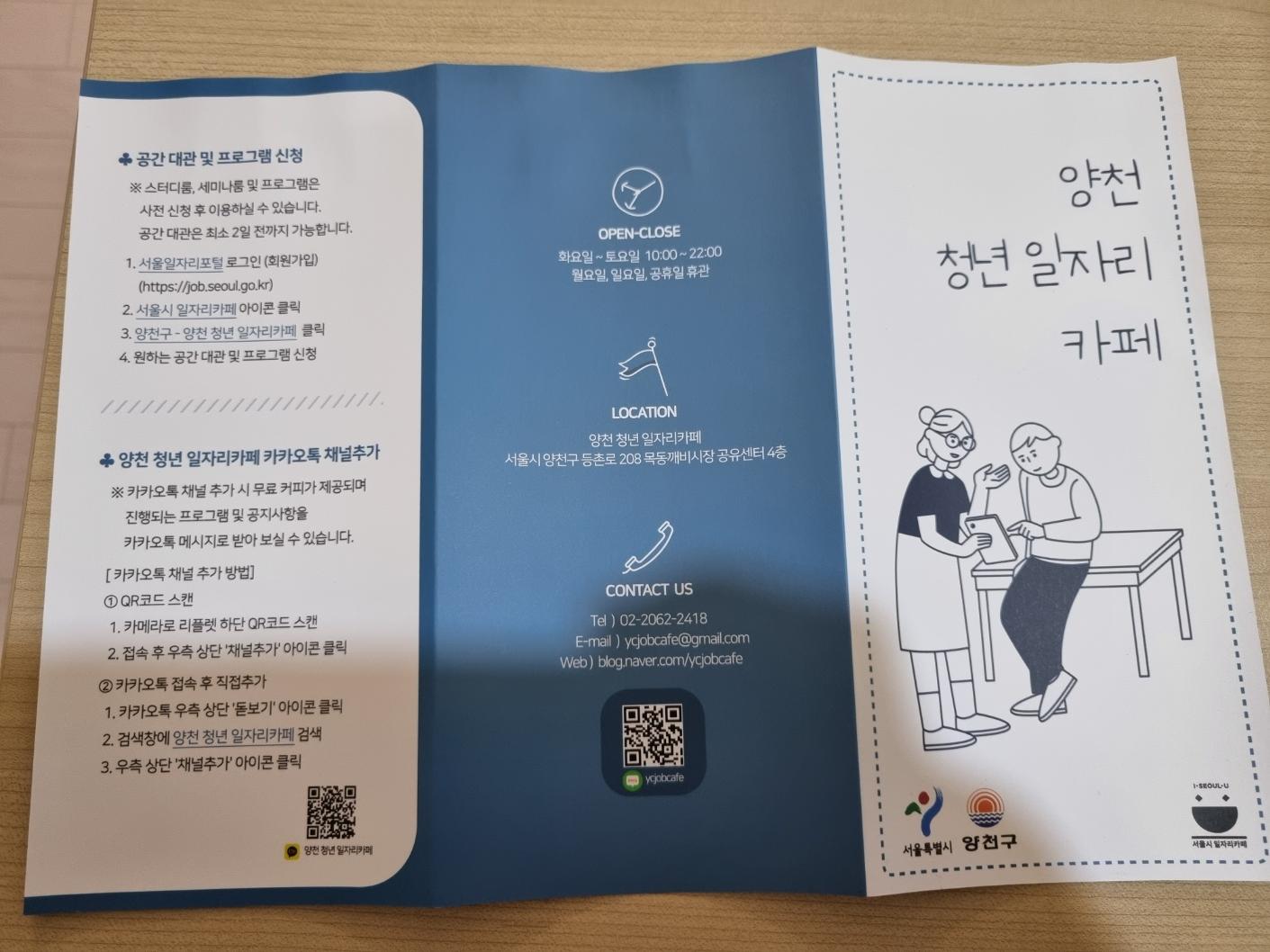 양천 청년 일자리 카페를 발견했다. 팜플렛도 얻었는데 일자리를 찾고 싶은 사람에게 유용해 보였다. 서울특별시 양천구에서 직접 운영하는 프로그램으로 보였다.
