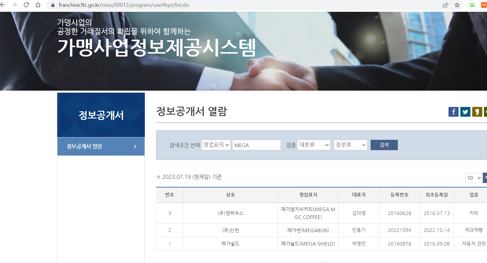일단 정보공개열람에서 "MEGA"라고 치면 메가엠지씨커피라는 것을 볼 수 있다. 우리가 메가커피라고 알고 있는 상호의 진짜 상호는 (주)앤하우스에서 운영하고 있는 MEGA MGC COFFEE라는 것을 알 수 있다. 사실 검색하면서 처음 알았다.
