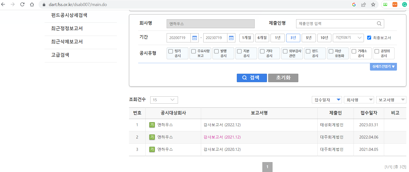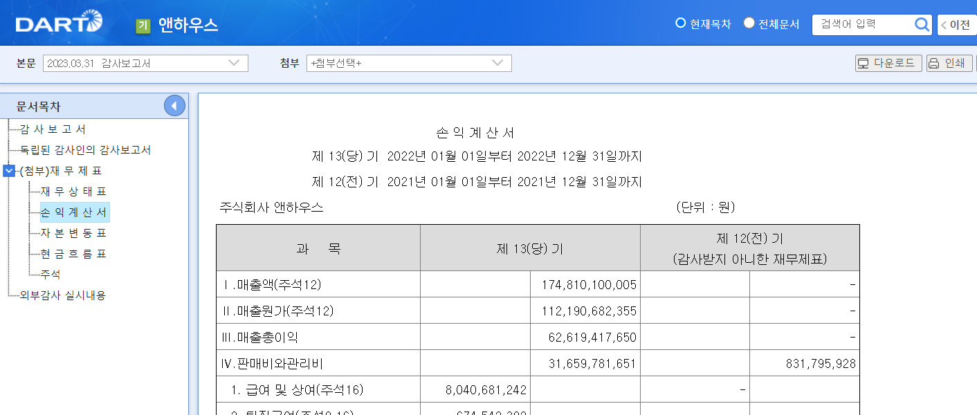 한번 전자공시사이트에서 숫자를 확인해보았다. 주석사항을 보면 필요한 내용이 있을 것 같아서 찾아보았다. 회사이름은 "앤하우스"로 검색하면 메가커피에 대한 재무제표와 손익계산서를 볼 수 있다.