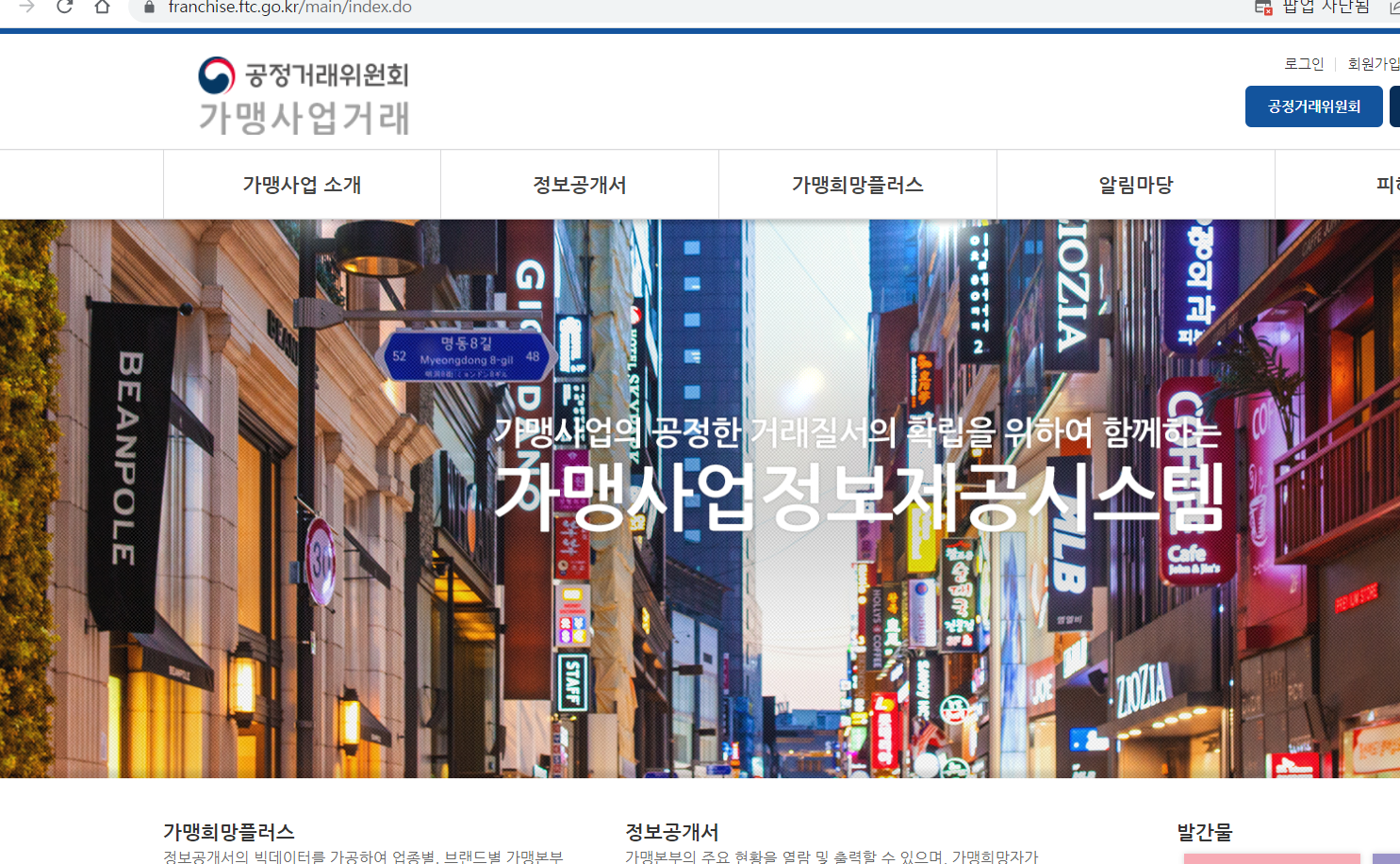 가맹사업누리집을 클릭하게 되면 프렌차이즈정보들이 모여있는 웹사이트로 이동할 수 있다.