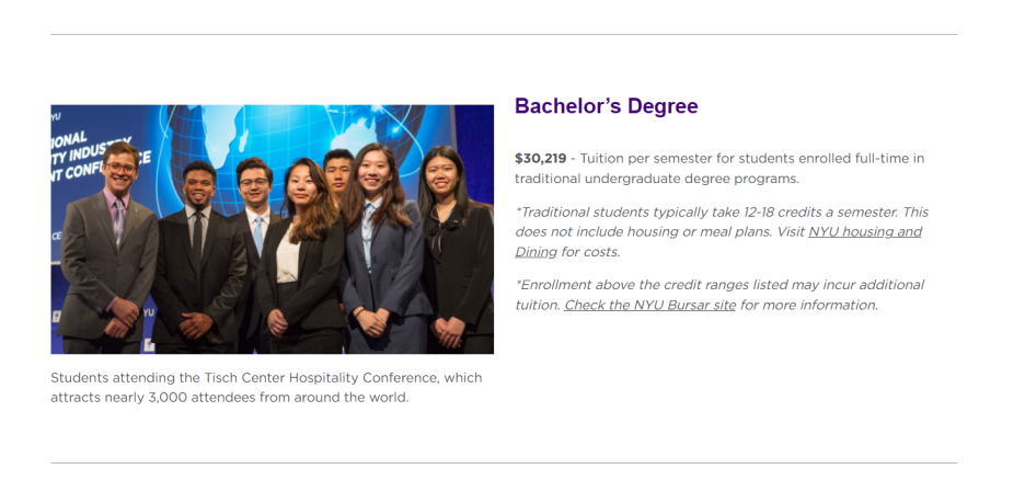 NYU는 사립대학교이다. 뉴욕주립대는 주립대학교이기 때문에 상대적으로 가격이 저렴하다. 그런데 NYU학비는 비싼 편에 속한다. 학교 웹사이트에 보면 3만달러 정도 학비가 한 학기에 들어가는 것으로 생각하면 얼추 맞는 것 같다. 학비를 계산하는 웹페이지를 운영하고 있는데 이 곳에서 학과를 선택해서 들어가면 대략적인 금액을 확인할 수 있다. 한 학기에 12에서 18학점을 듣기 때문에 학점에 따라 비용 차이가 있을 수 있지만 일단 학비는 한 학기에 3만달러 정도 생각하는 것이 합리적이다.