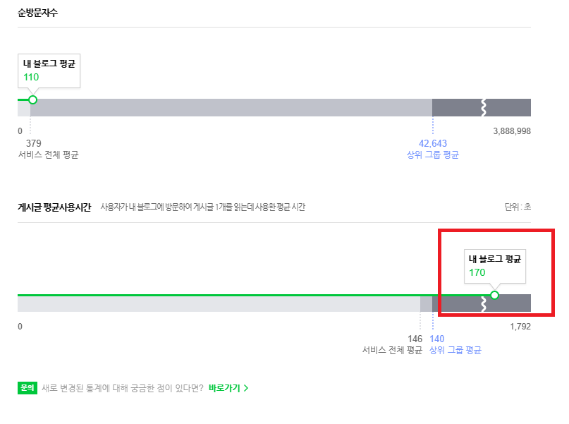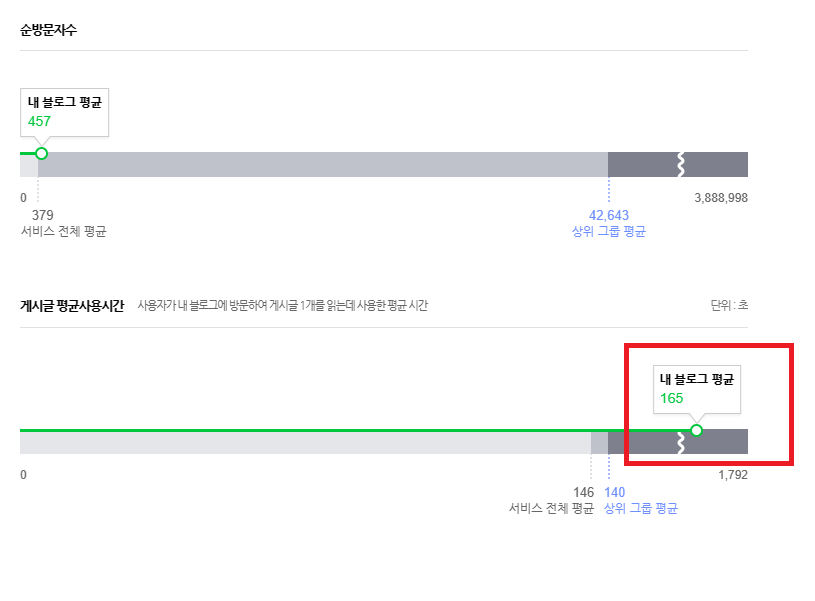 블로그 운영 기간에 따라 조회수 자체는 적기도 하고 많기도 하다. 하지만 일단 내가 손을 대는 블로그는 일단 게시글 평균사용시간은 상위 그룹 평균을 상회한다. 검색해서 들어오는 사람들은 포스팅 내용을 꼼꼼히 본다는 것이고 다른 포스팅도 같이 본다는 것을 확인할 수 있다.