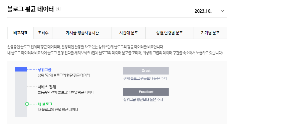 블로그 실적은 여러가지로 평가할 수 있다. 조회수, 순방문객수, 게시글 평균사용시간으로 나눌 수 있다. 일단 소재자체가 일반적이지 않으면 조회수와 순방문객수는 낮을 수 밖에 없다. 사람들이 관심있어하는 키워드 대략 먹을 것, 입을 것, IT 관련은 조회수가 높다. 그런데 안타깝게도 나는 이 것들과 관련이 없는 주제을 다룬다. 그래서 조회수, 순방문객수는 높지 않다. 일반 블로그 평균에 미치지 못한다.