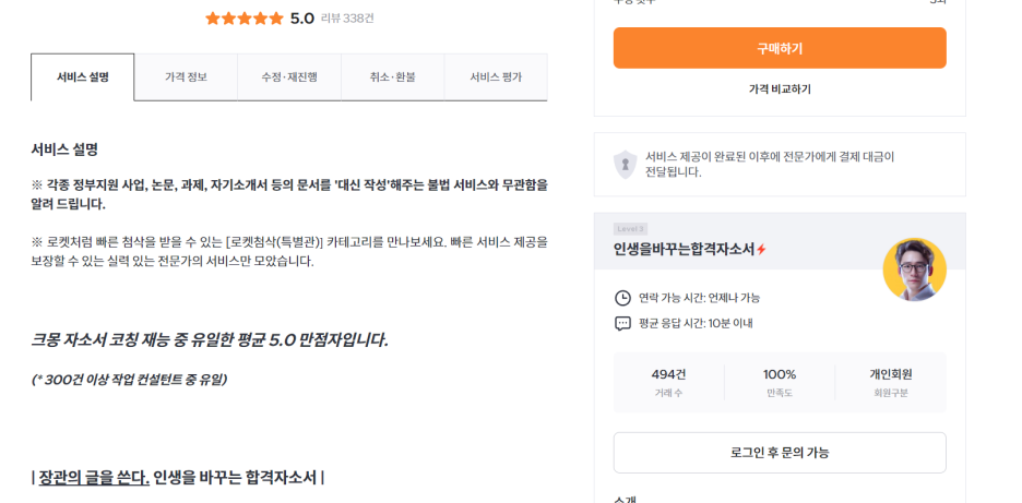 그러면 대략 어떤 식으로 운영을 하면 되는지 감을 얻을 수 있다. 예를 들어, 유학 또는 자소서쪽 분야를 본다고 해보자. 그러면 평점이 높거나 거래수가 가장 높은 곳을 찾아보면 몇 사람을 볼 수 있다. 그 중 "Prime"평가가 있는 사람을 찾아보면 어떤 퍼스널 브랜딩을 컨셉으로 잡는지 알 수 있다.