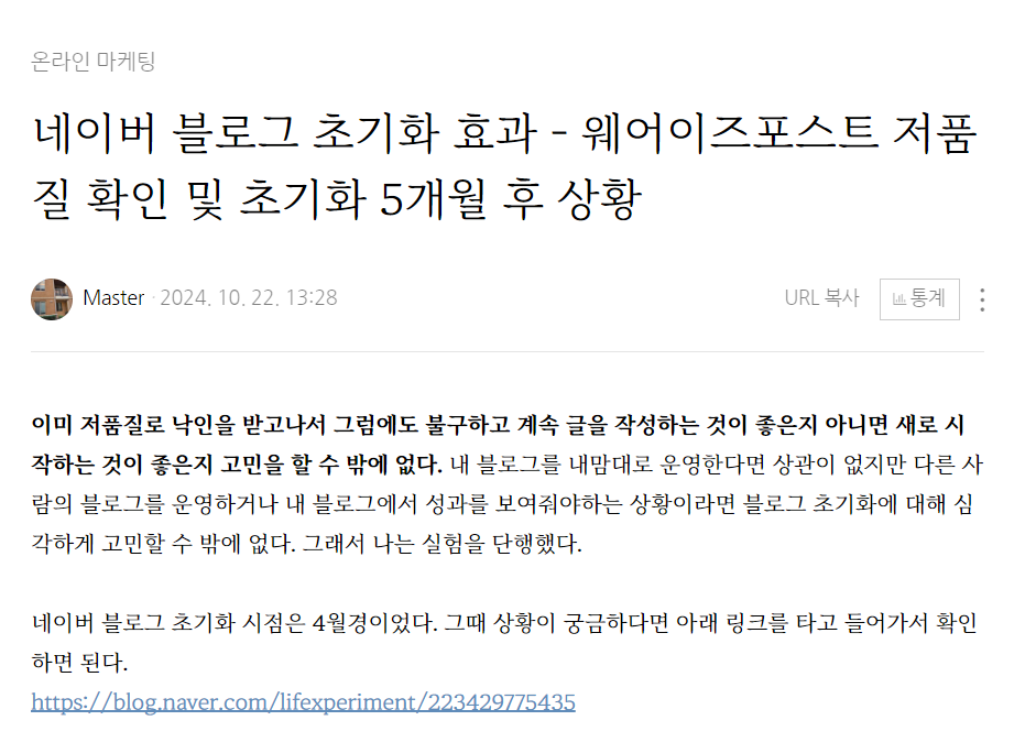 일단 저품질이 되었는지 여부는 검색량을 통해 확인할 수 있다. 내가 자주 보던 검색량이 아니라 훨씬 떨어진 검색량을 보게 된다면 이 때 문제가 발생했다고 볼 수 있다. 웨어이즈포스트를 통해서 어떤 포스팅이 "Bad"인지 즉 저품질에 해당되는지 확인할 수 있다. 아무리 글을 써도 순위가 올라가지 않는 경우를 보게 되는데 이 경우 필시 "저품질"에 걸렸다고 볼 수 있다. 1. 저품질임에도 계속 글을 쓰는 것이 좋을까?나는 개인적으로 이 방법은 비추천한다. 아무리 글을 계속 써 내려가도 조회수 반등은 없다. 네이버가 이미 저품질로 잡아버렸다면 별 쇼를 벌이더라도 결국 저품질에서 올라가기 어렵다. 네이버를 뒤져보면 "저품질에 걸릴만한 포스팅만 다시 지우면 됩니다."라고 한다. 일단 그 포스팅을 찾는 것 자체가..