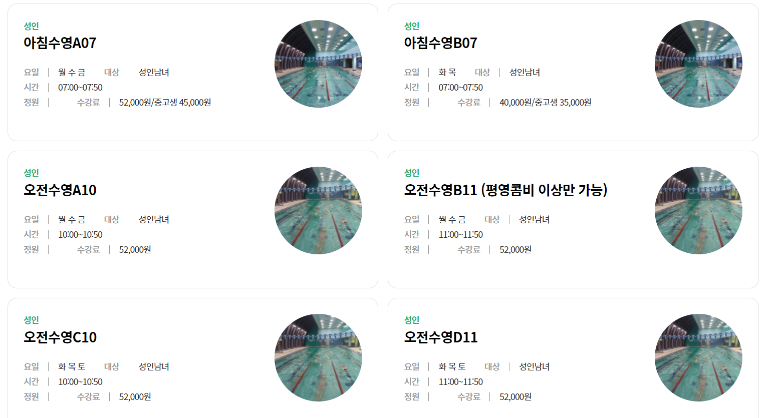2. 프로그램이 다양하다. 아침, 오전, 오후, 저녁까지 시간에 맞춰 수업을 들을 수 있다. 주변 수영장은 내가 편한 시간에 수영을 하기가 어려웠다. 다양한 시간을 선택할 수 있도록 프로그램이 배치되어 있기 때문에 이용하기 수월한 것 같다. 그래서 사람들로부터 인기가 좋은 것 같다.