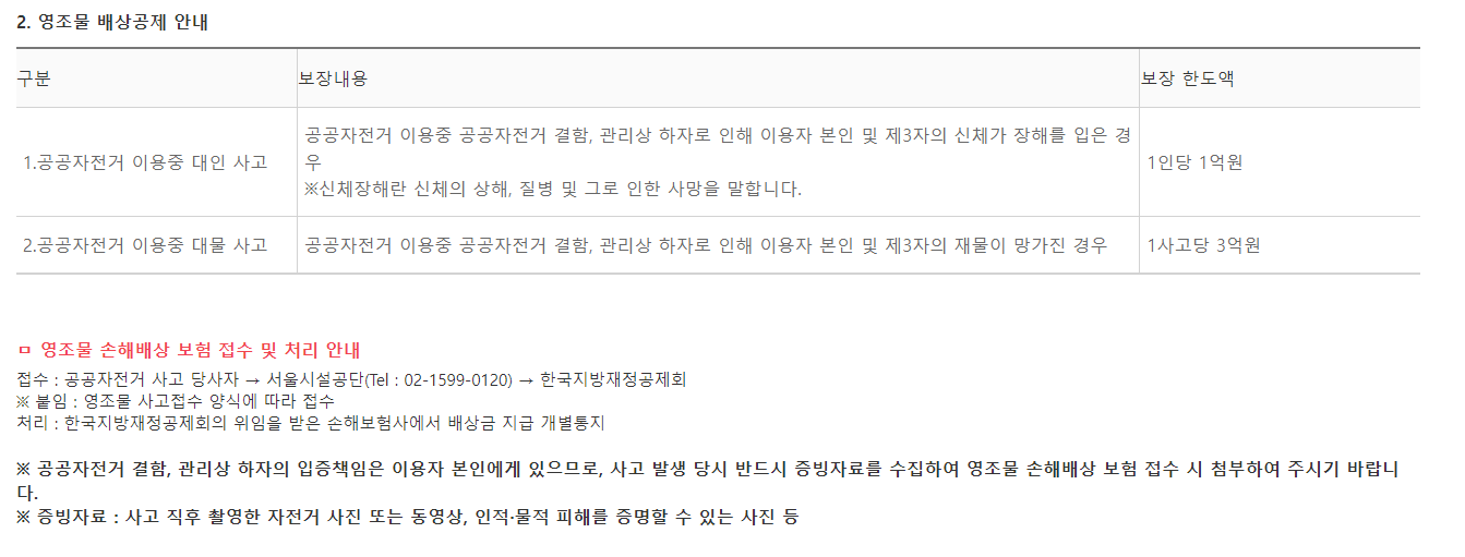 본인이 따릉이를 사용하다가 다치는 경우 사고 크기에 따라 2,000만원까지 보호를 받을 수 있다. 그리고 남의 재산에 피해를 주었더라도 200만원까지 보호 받을 수 있다. 물론 이 때는 자기 부담금 10만원을 내야한다. 타인에 상해를 입힌 경우 300만원까지 보호 받을 수 있다. 만약 따릉이 결함, 관리상 하자가 있다면 보상 금액이 상해는 1억원, 재산피해는 3억원까지 상향된다.