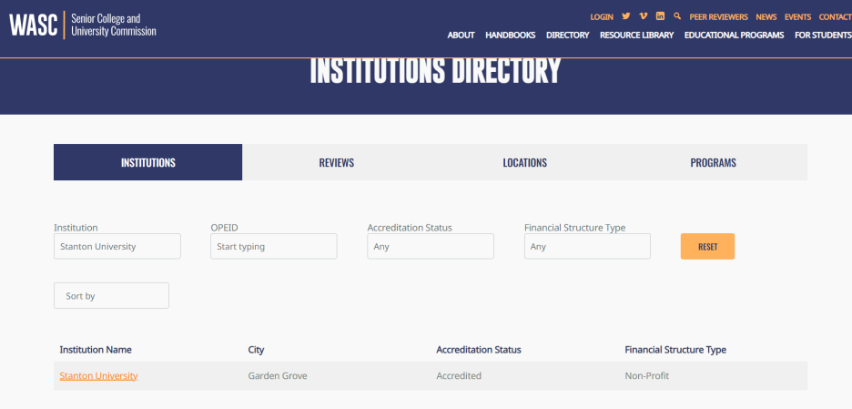 Stanton university는 WASC소속 대학교이다. 실제 WASC-Senior college and University Commission을 검색해보면 학교를 찾을 수 있다. 미국 Accreditation system을 알고 있는 사람은 WASC에 들어가는 것이 얼마나 힘든 것인지 알겠지만 미국 교육 체계를 잘 모른다면 그 의미를 알 수 없다. 만약 당신이 어떤 유학원을 갔는데 WASC에 대해서 알고 있다면 유학 및 편입 계획을 짜는 것이 많이 달라질 수 있다.