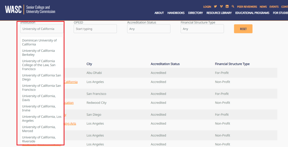 위와 같이 "University of California"를 치면 여러 목록을 볼 수 있다. 그리고 UC버클리, UC얼바인, UC데이비스, UCLA등 학교가 WASC소속인 것을 확인할 수 있다. 그렇다면 스탠톤 대학교를 통한 편입이 가능하다는 것을 알 수 있다.